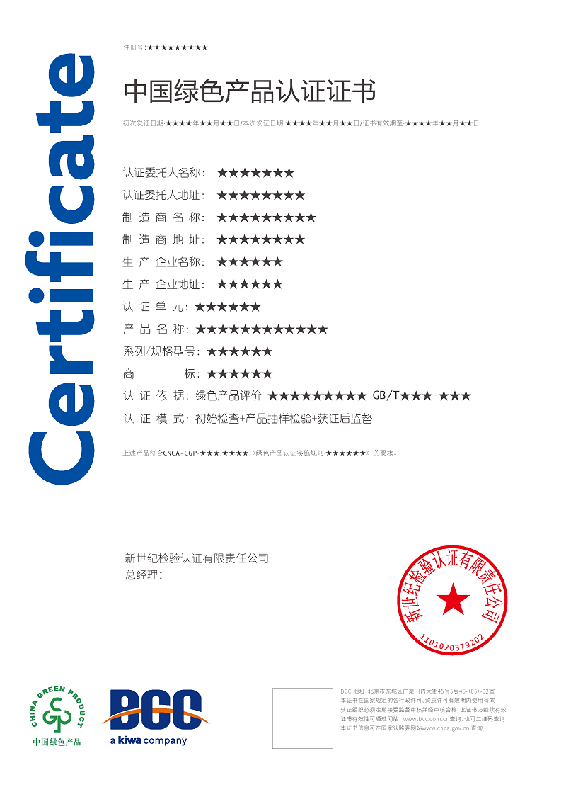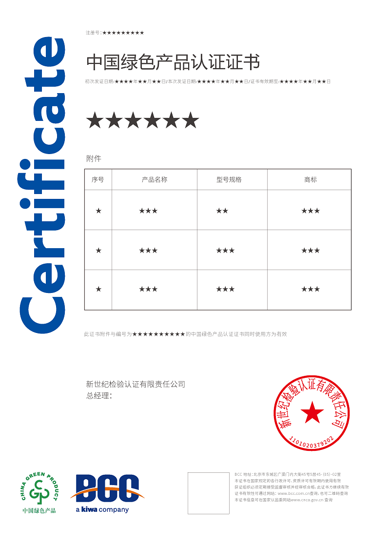 目前,BCC已順利通過國家認證認可監(jiān)督管理委員會(CNCA)審批,獲得了多項綠色產品認證資質,包括: