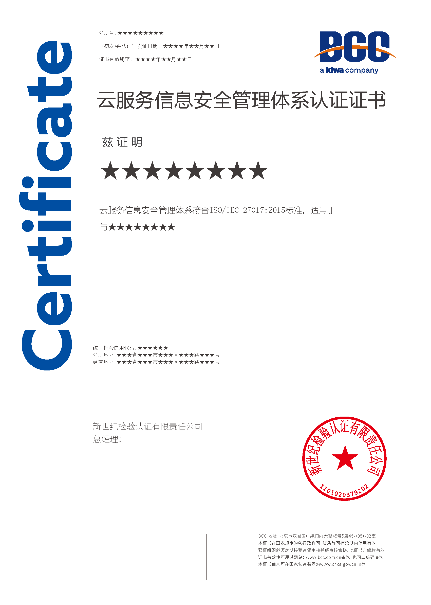本頁(yè)涉及的認(rèn)證服務(wù)中均有對(duì)應(yīng)的《認(rèn)證實(shí)施規(guī)則》,BCC擁有其最終解釋權(quán)。任何組織及個(gè)人未經(jīng)BCC許可,不得以任何形式全部或部分使用(法律要求除外)認(rèn)證相關(guān)信息。如需獲取相關(guān)實(shí)施規(guī)則請(qǐng)用以下方式聯(lián)系獲取:電話:010-58579316 郵箱:fwjs@kiwa.cn