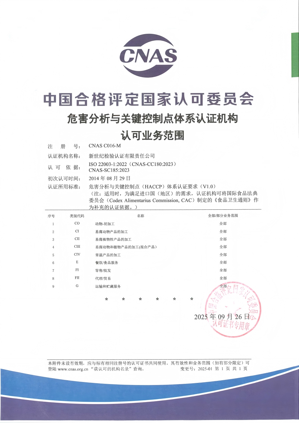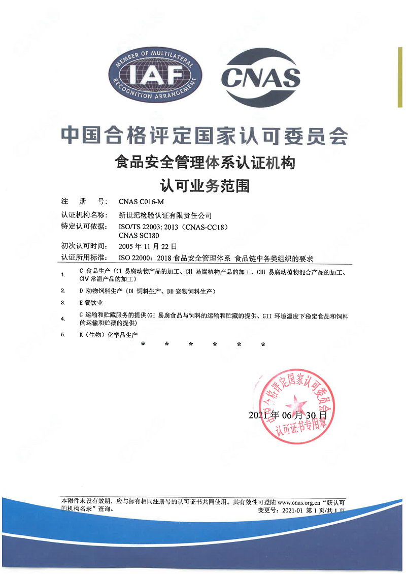 危害分析與關(guān)鍵控制點認證機構(gòu)認可證書 |