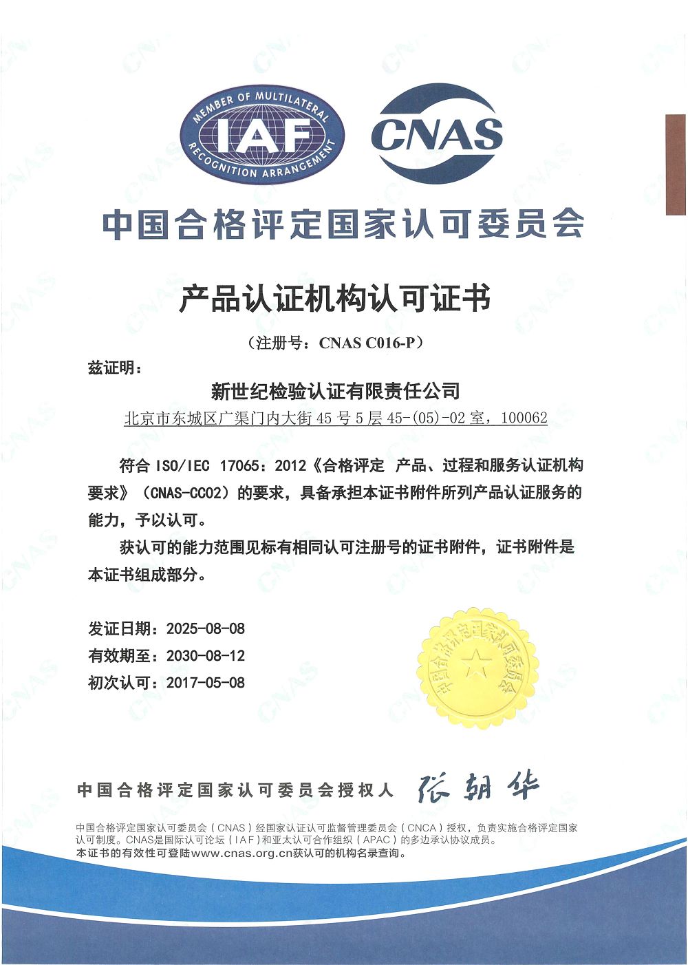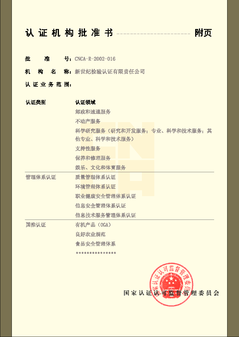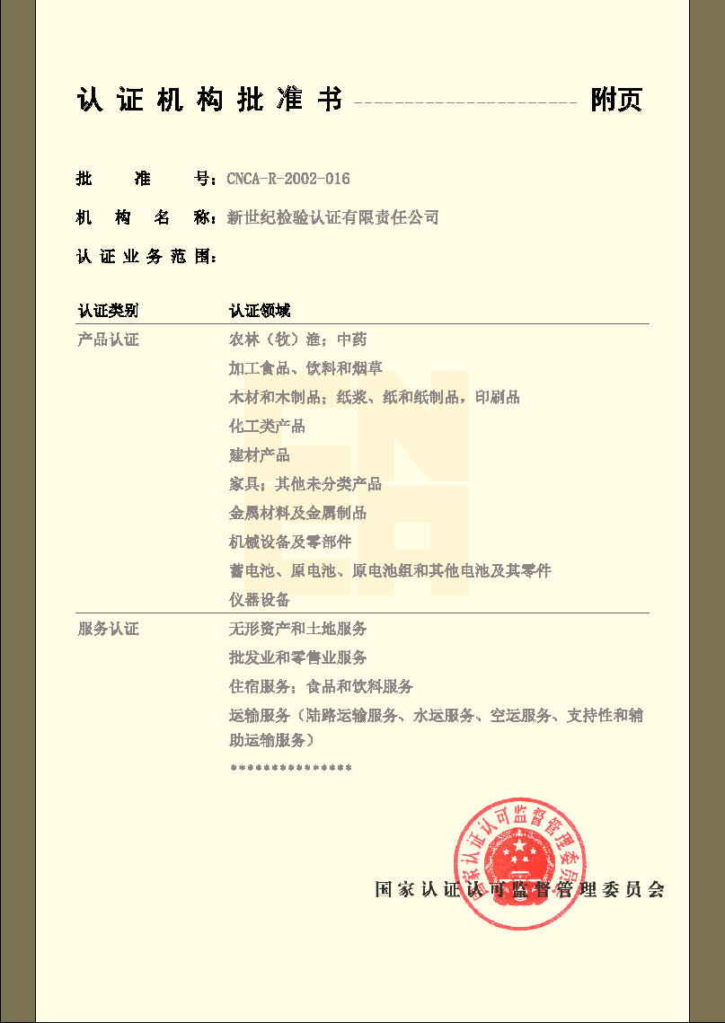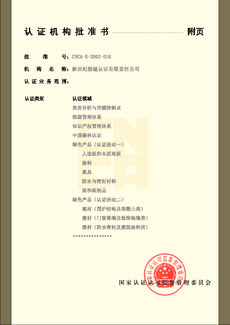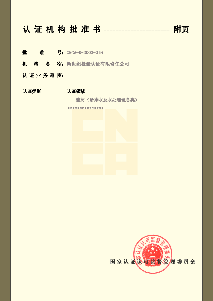 產(chǎn)品認證機構(gòu)認可證書 |