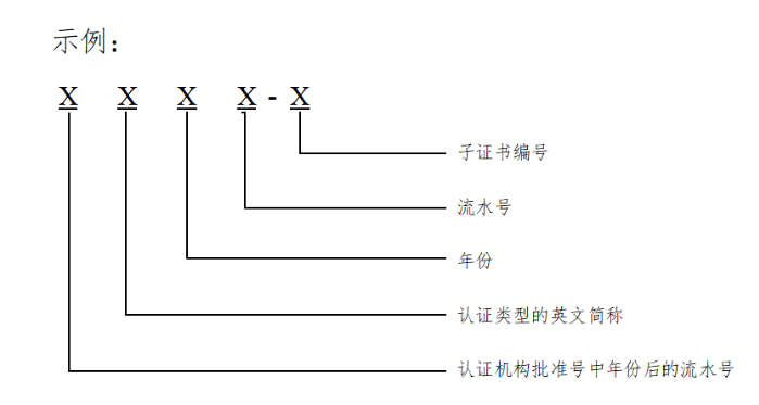 內(nèi)資認(rèn)證機構(gòu)認(rèn)證證書編號為該機構(gòu)批準(zhǔn)號的3位或4位阿拉伯?dāng)?shù)字流水號;外資認(rèn)證機構(gòu)認(rèn)證證書編號為F+該機構(gòu)批準(zhǔn)號的2位或3位阿拉伯?dāng)?shù)字流水號。