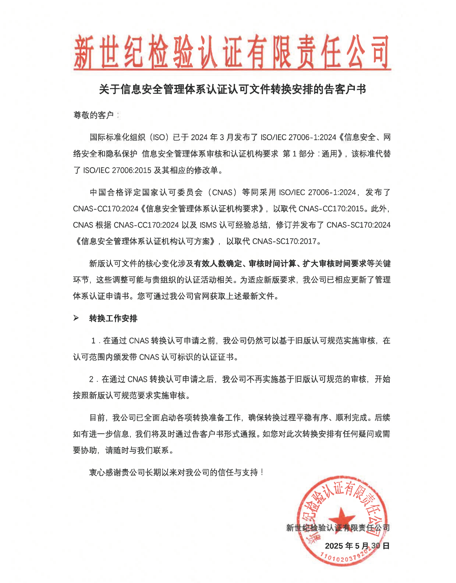關于信息安全管理體系認證認可文件轉換安排的告客戶書