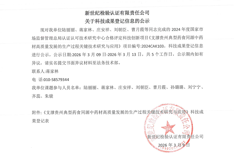 現(xiàn)對我單位陸麗麗、蔣家林、莊安祥、劉朝臣、曹月霞等同志完成的2024年度國家市場監(jiān)督管理總局認(rèn)證認(rèn)可技術(shù)研究中心合格評定科技創(chuàng)新項目《支撐貴州典型藥食同源中藥材高質(zhì)量發(fā)展的生產(chǎn)過程關(guān)鍵技術(shù)研究與應(yīng)用》項目編號:2024CAK103,科技成果登記信息進行公示,公示日期:2026年3月09日-2026年3月13日,共5個工作日,公示期內(nèi)如有異議,請實名提交書面異議材料至法務(wù)技術(shù)部。
